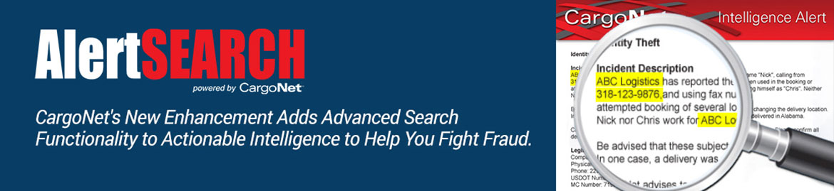 AlertSearch provides advanced search functionality to actionable intelligence within the CargoNet database. It can be utilized to directly reduce your chances of becoming a cargo theft victim. AlertSearch allows you to search CargoNet's extensive archive of alerts by any suspect name, phone number, email address, and much more. Ultimately, anything you can think of can now be searched and used to help you avoid identity theft, fictitious pickups, other transportation related scams and aide in your carrier validation efforts.